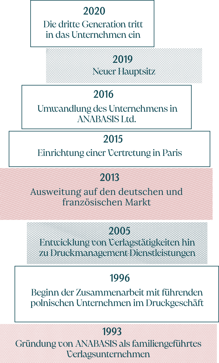 ANABASIS vereint drei Generationen einer Familie, die gemeinsam ihre Leidenschaft für Bücher und Druck leben und daraus das florierende Unternehmen gemacht haben, das ANABASIS heute ist. Unser Name* ist Programm: Wir befinden uns auf einer Reise ohne Grenzen – einer Reise, auf der wir Herausforderungen meistern und neue Höhen erklimmen, stets einem Ziel entgegen. Mit Geduld und Liebe zum Detail bieten wir unsere Dienstleistungen an. Offenheit, Vertrauen und Zuverlässigkeit sind die Werte, für die unser Unternehmen steht.